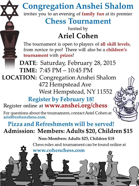 We are pleased to announce the premier chess tournament of Congregation Anshei Shalom, hosted by our very own Ariel Cohen! This tournament is open to players of all skill levels, from novice to pro. There will also be a children's tournament with prizes! Regulars of the Cohen Chess Tournament know this is going to be a lot of fun, and we encourage everyone to come and enjoy a fun family event at the shul!