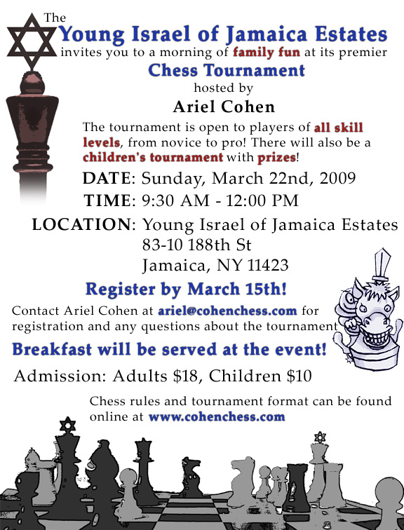 Please register for the tournament before March 15th. To register or ask for more information about the tournament, send an email to Ariel Cohen, the host of the YIJE Chess Tournament, at ariel@cohenchess.com.