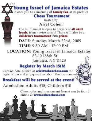 We are pleased to announce the premier chess tournament of the Young Israel of Jamaica Estates, hosted by our very own Ariel Cohen! This tournament is open to players of all skill levels, from novice to pro. There will also be a children's tournament with prizes! Regulars of the Cohen Chess Tournament know this is going to be a lot of fun, and we encourage everyone to come and enjoy a fun family event at the shul!